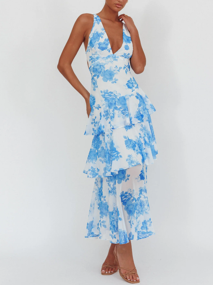 Strappy Back Ruffle Maxi Dress Roses Blue