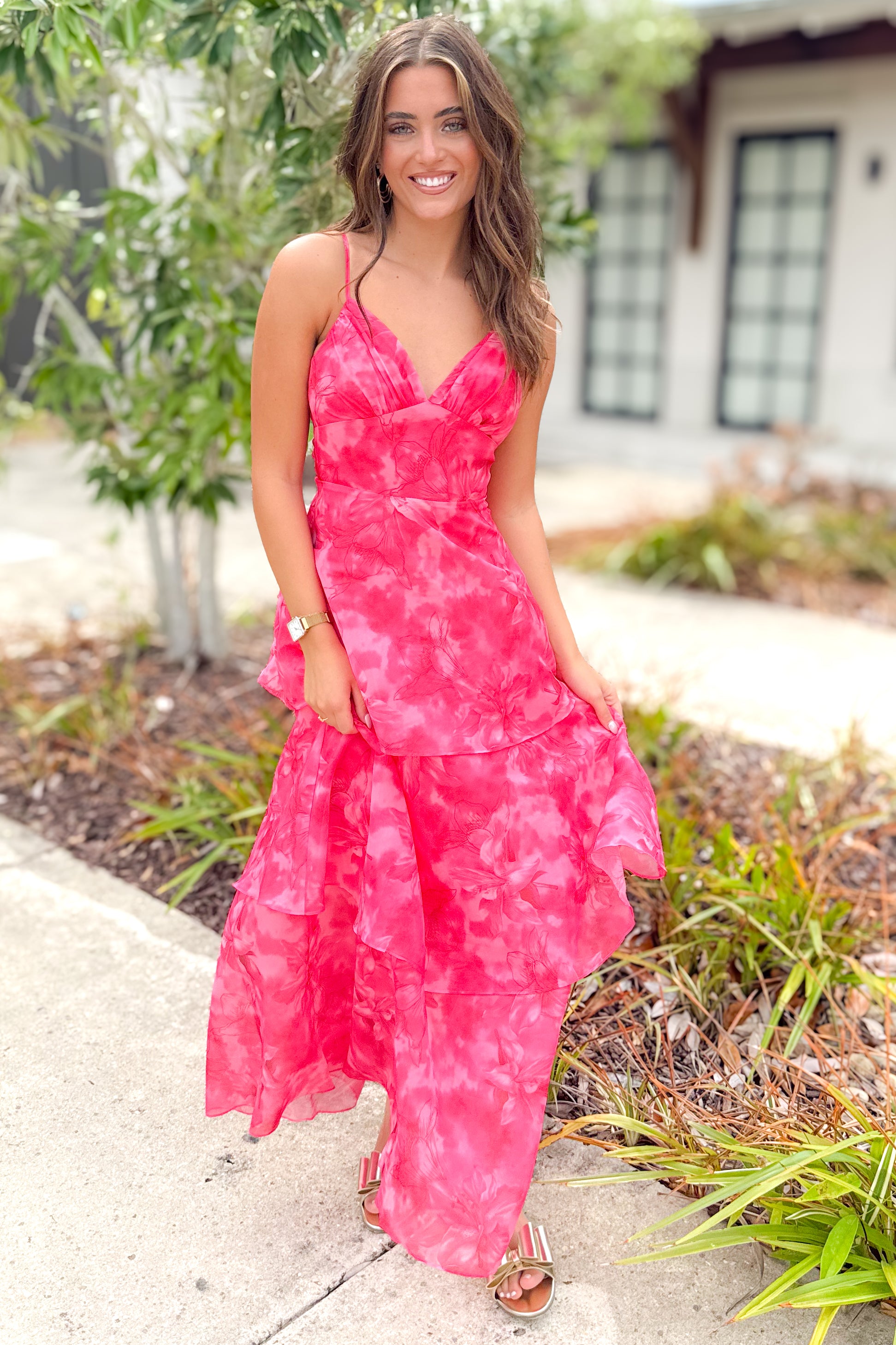 New Wedding Guest Pleated Body See-Through Maxi Dress with Red Floral Pattern