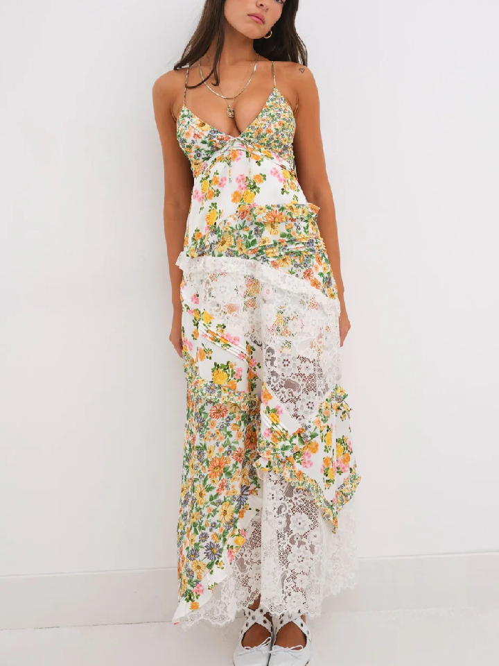 Multi-color Lace Stitching Elegant Strapless Maxi Dress
