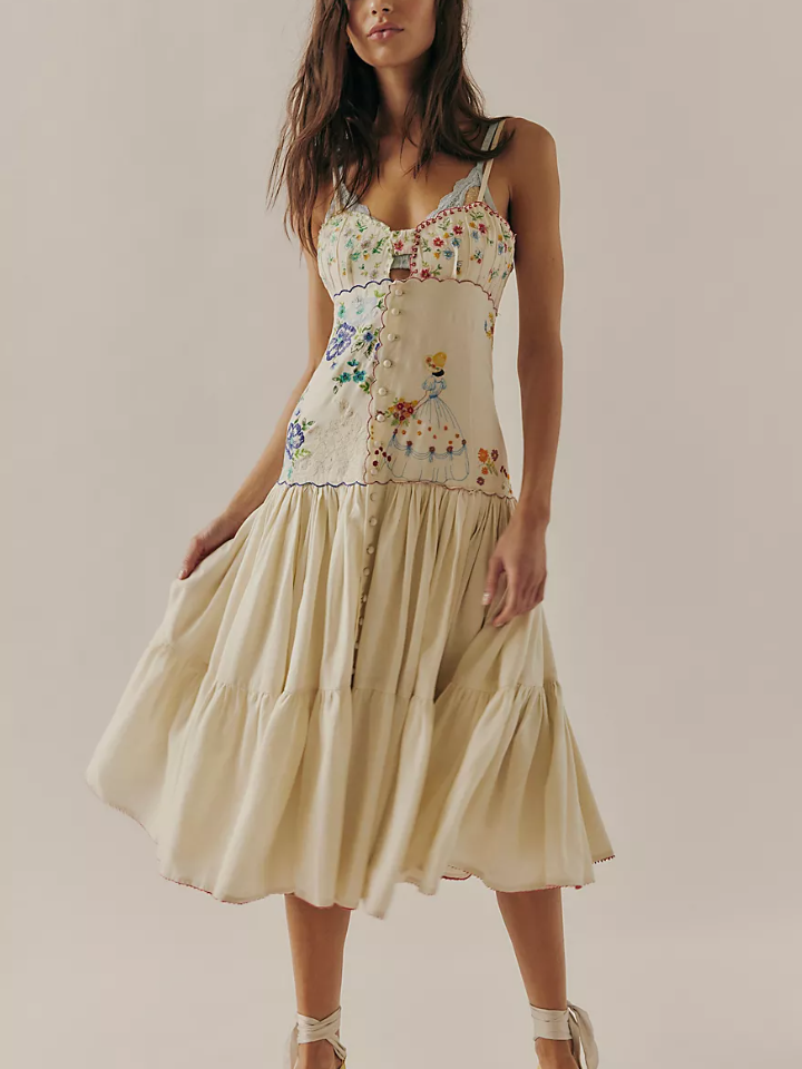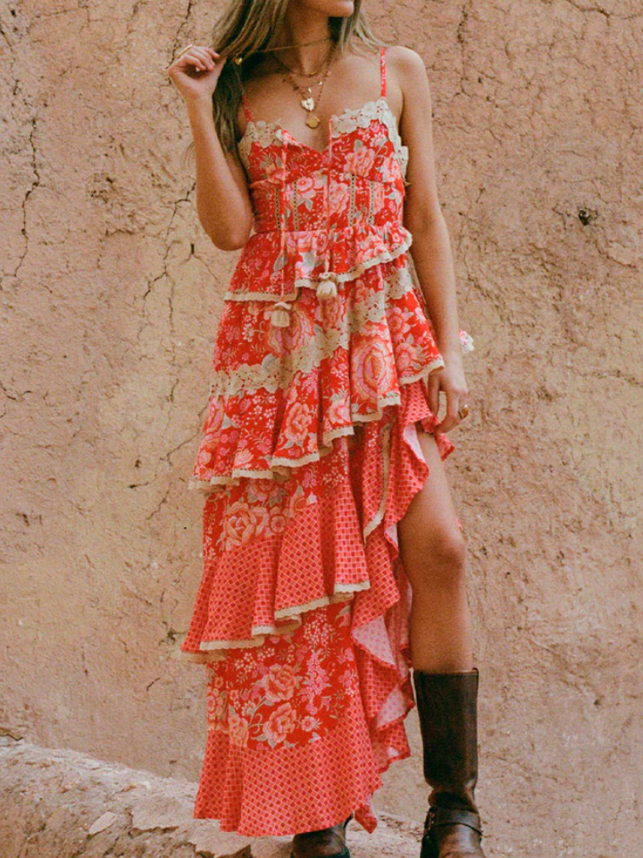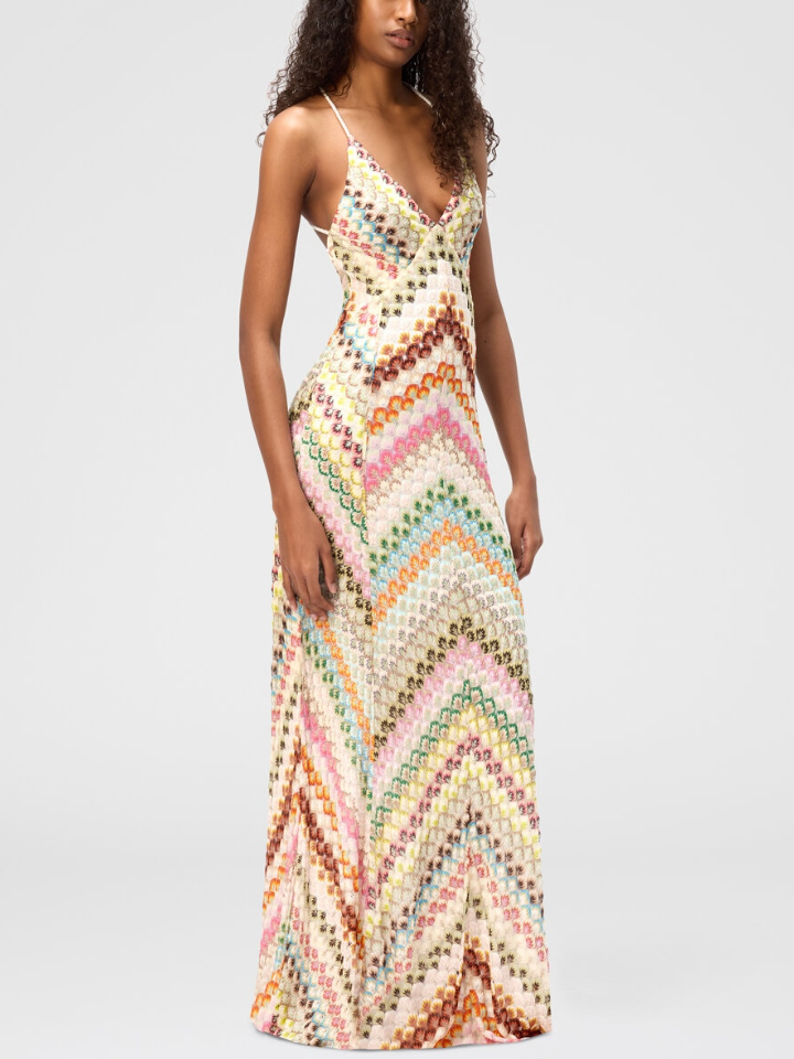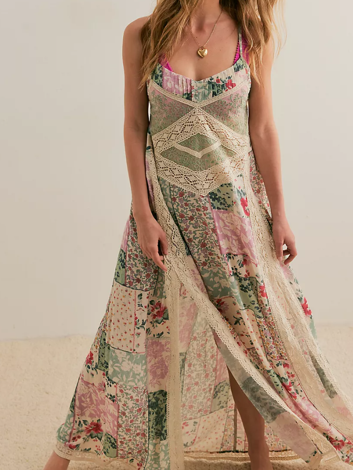 Multicolor Lace Stitching Wave Suspender Maxi Dress
