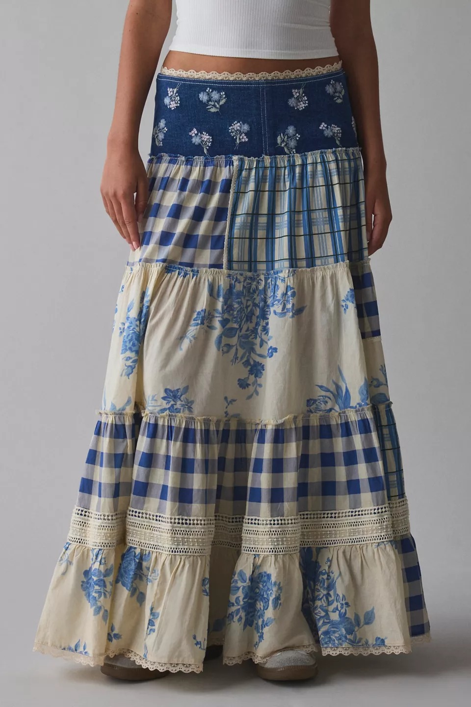 Blue Patchwork Lace-Trimmed Slit Maxi Skirt