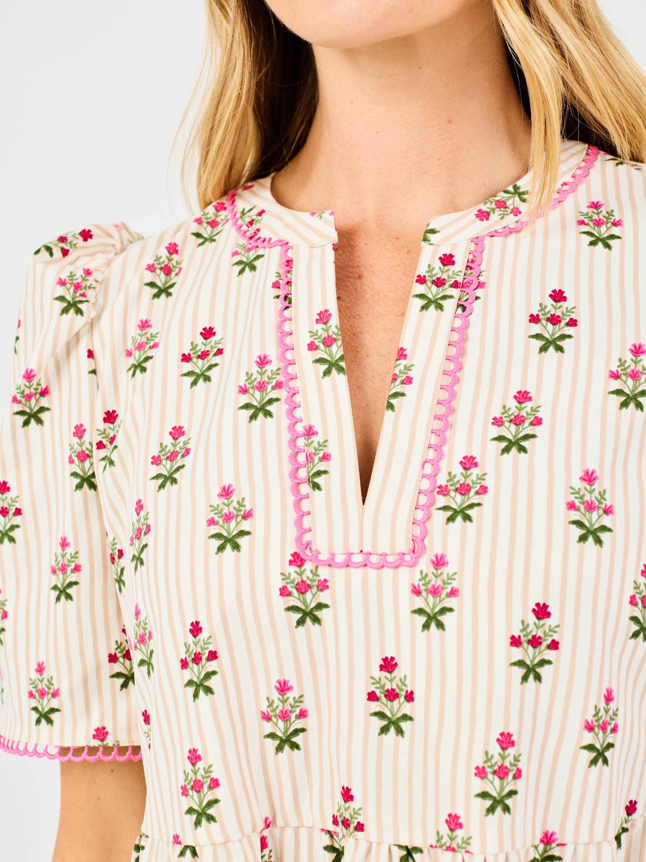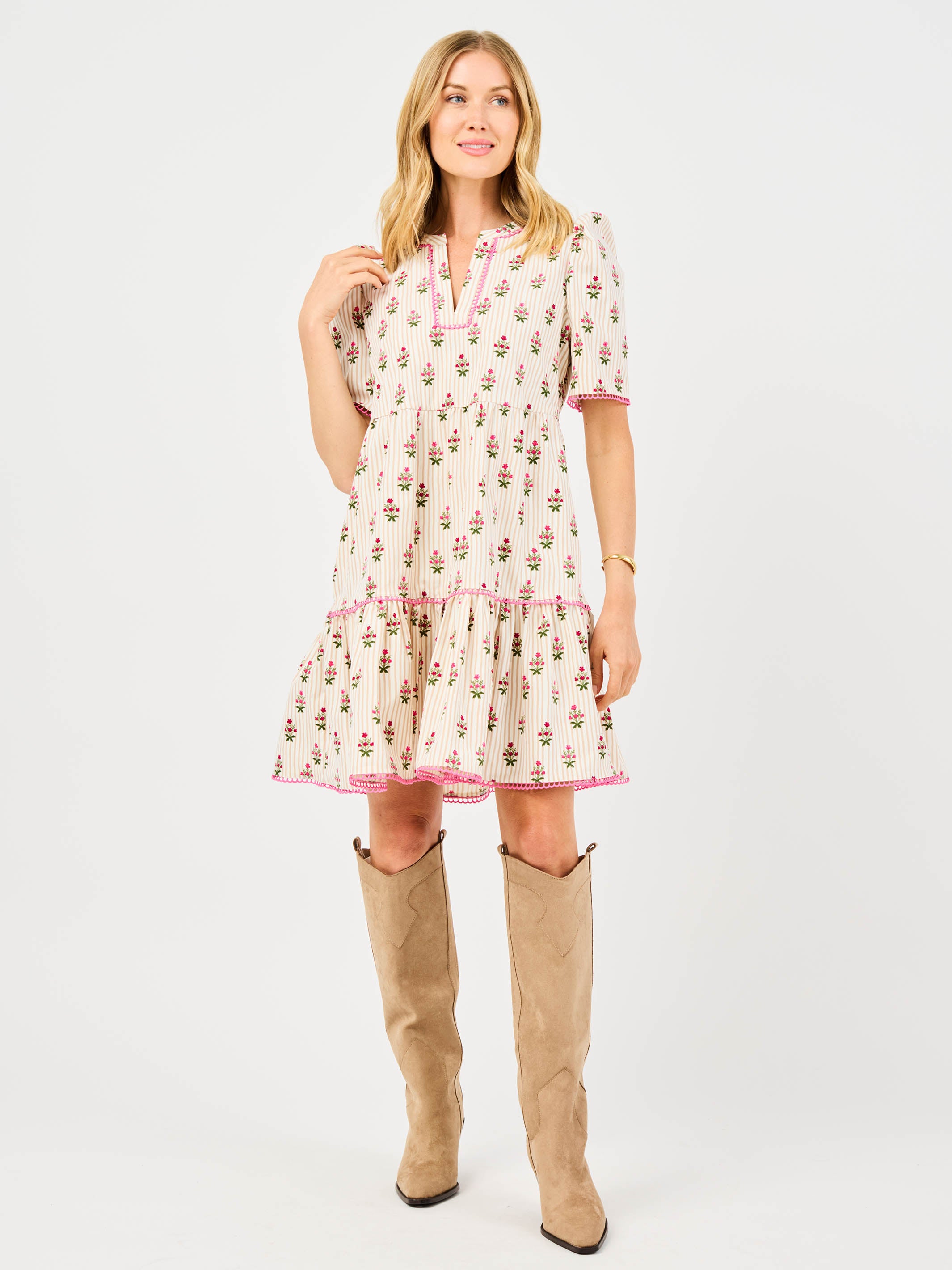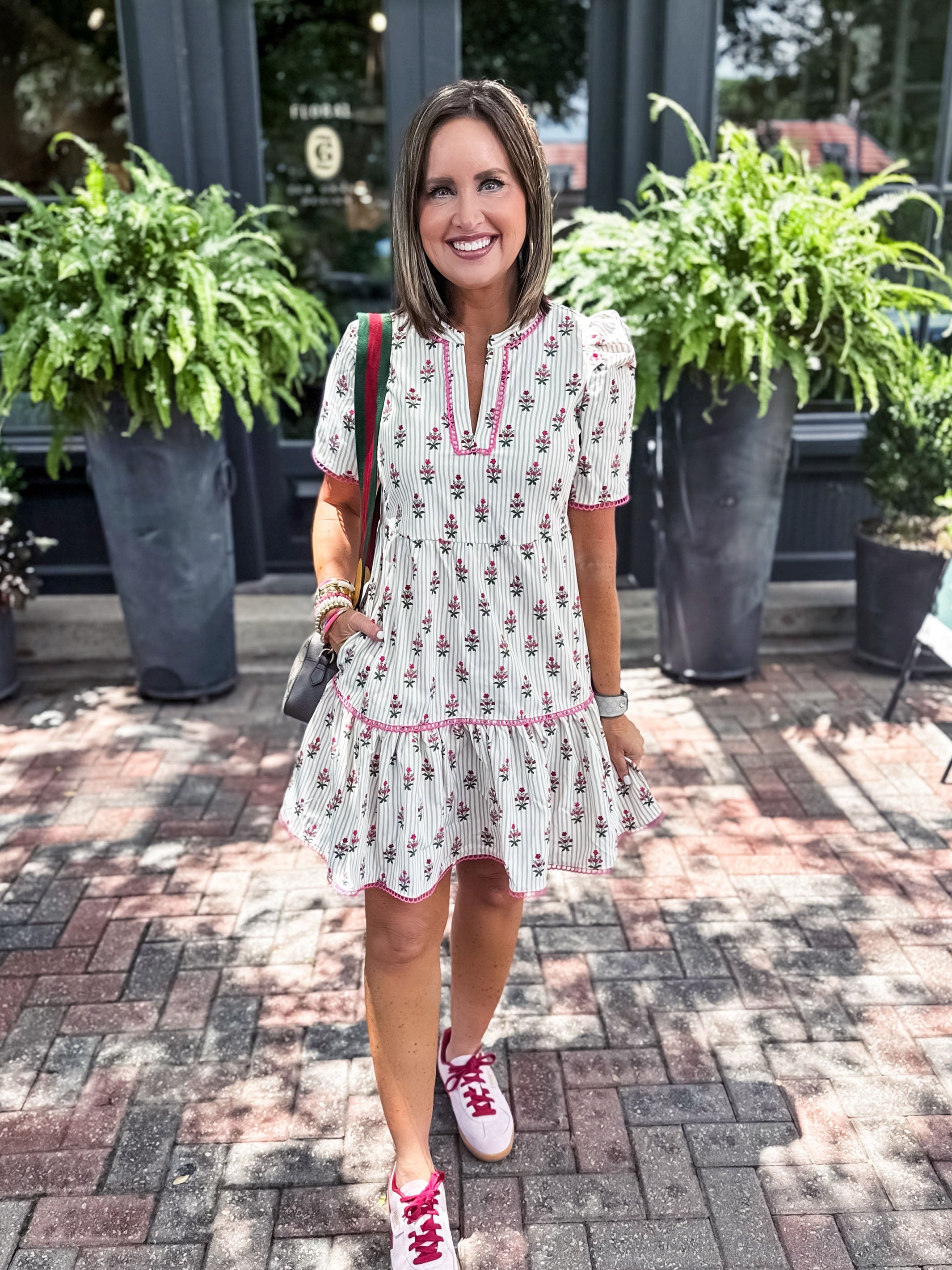 The Adelyn Dress is a timeless piece that combines playful details with everyday comfort. Featuring scallop trim accents for a delicate touch, a split neckline for a relaxed yet flattering fit, and short puff sleeves for a fun, airy feel, this dress is designed for effortless style. Practical pockets add functionality, making it perfect for casual outings or dressier occasions.