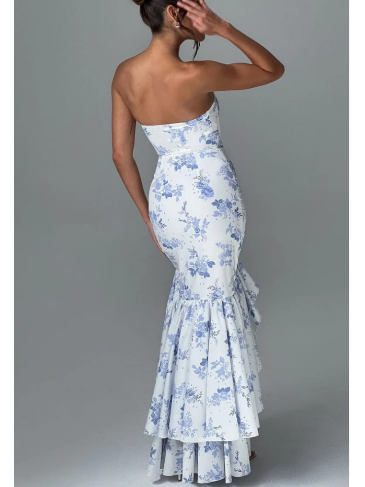 Enter your soft girl era in the Angelina maxi dress, crafted in our luxury non-stretch cotton blend fabric that hugs the body for the silhouette of dreams. This strapless design is complete with a voluminous frilled high low skirt that's super pretty and playful.