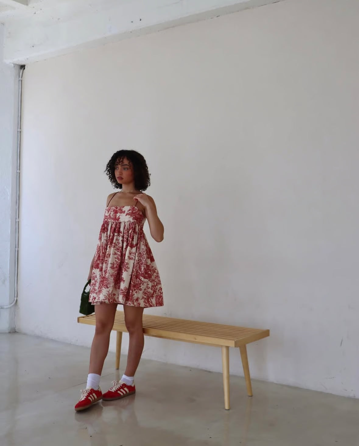 A playful strapless mini dress with a voluminous puff skirt and warm beige base, accented by wine-red print details.