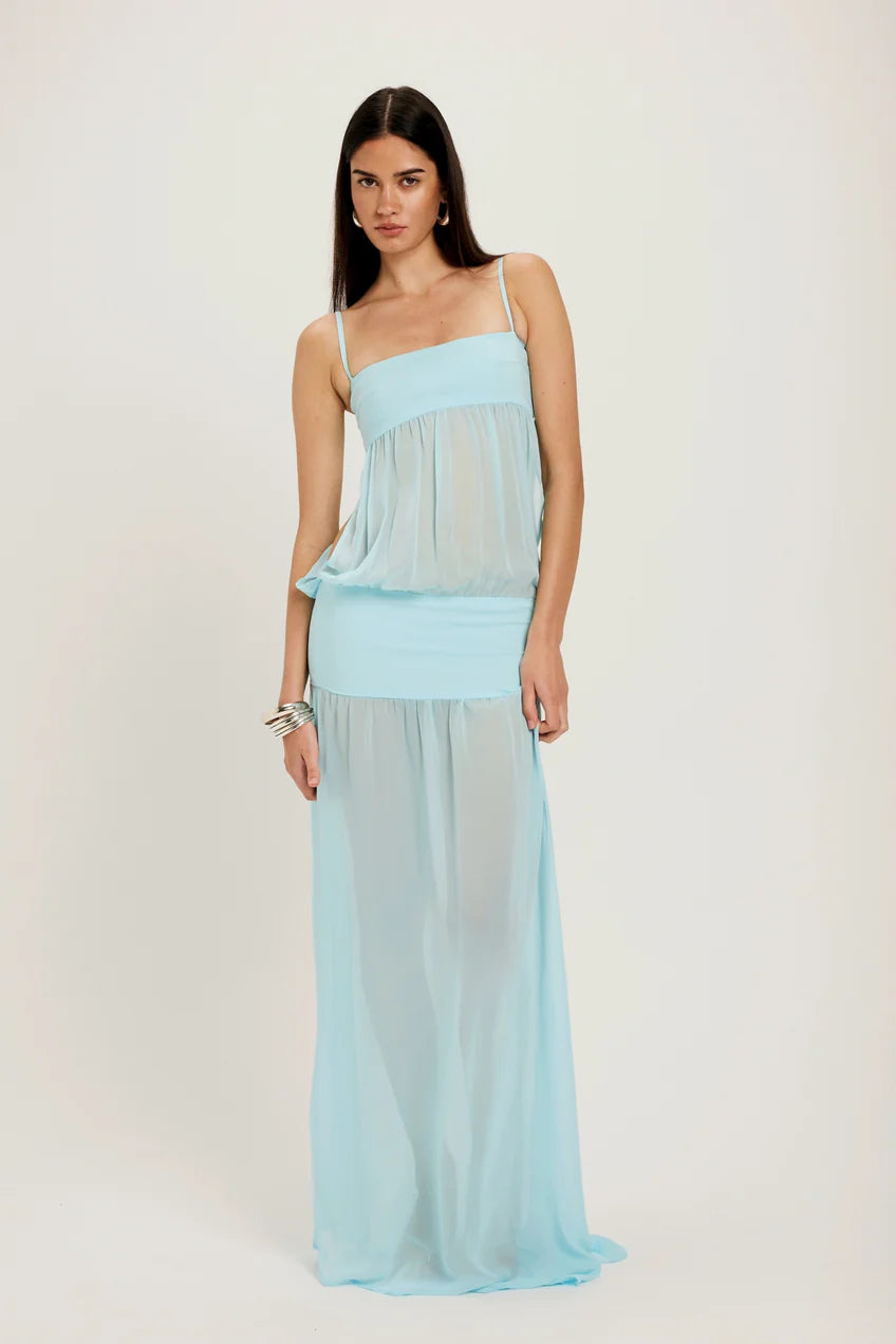 Vacation glamour perfected. This sky-blue maxi dress features a strapless neckline, sheer panel detailing, and a waist cut-out that highlights your curves while keeping the look light and effortless.