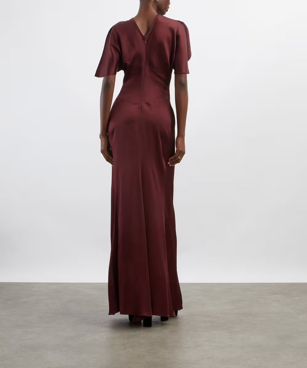 Effortlessly elegant with a soft glow. This burgundy satin gown features delicate ruching at the waist and a fluid drape that flatters every curve. The round neckline and short sleeves balance romance with timeless sophistication.