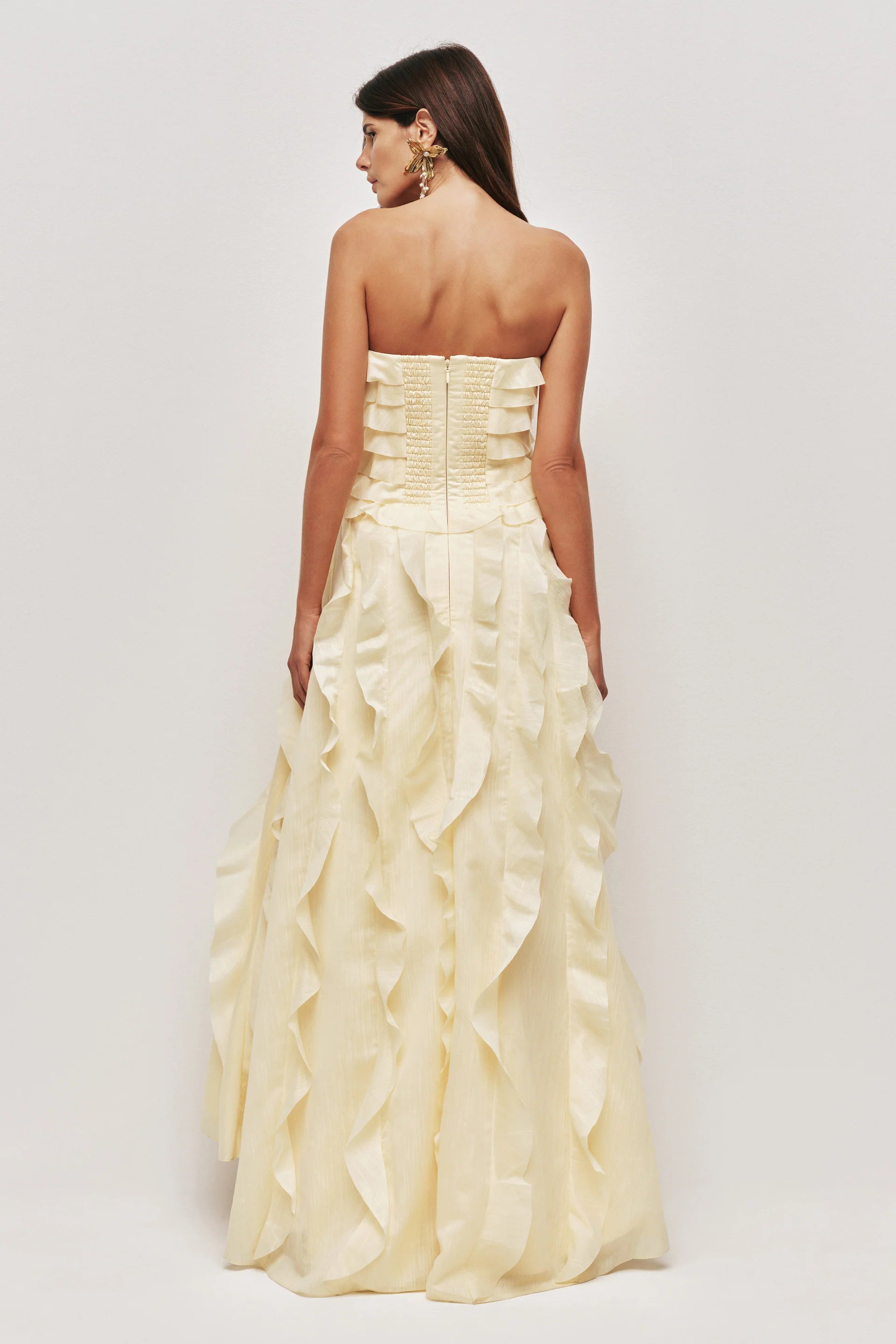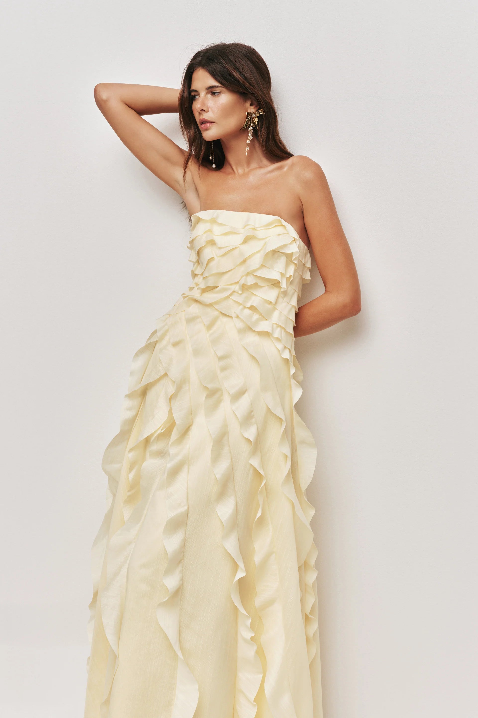 Make a luminous entrance in this butter yellow strapless evening gown. Designed with cascading layered ruffles and a dramatic thigh-high slit, this silhouette elongates the legs while maintaining refined elegance.