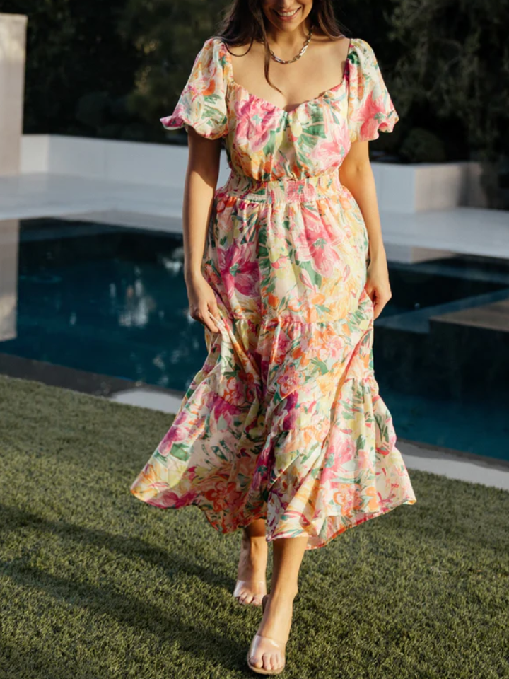 - Bright Pink, yellow, and green multi color floral print on cream background