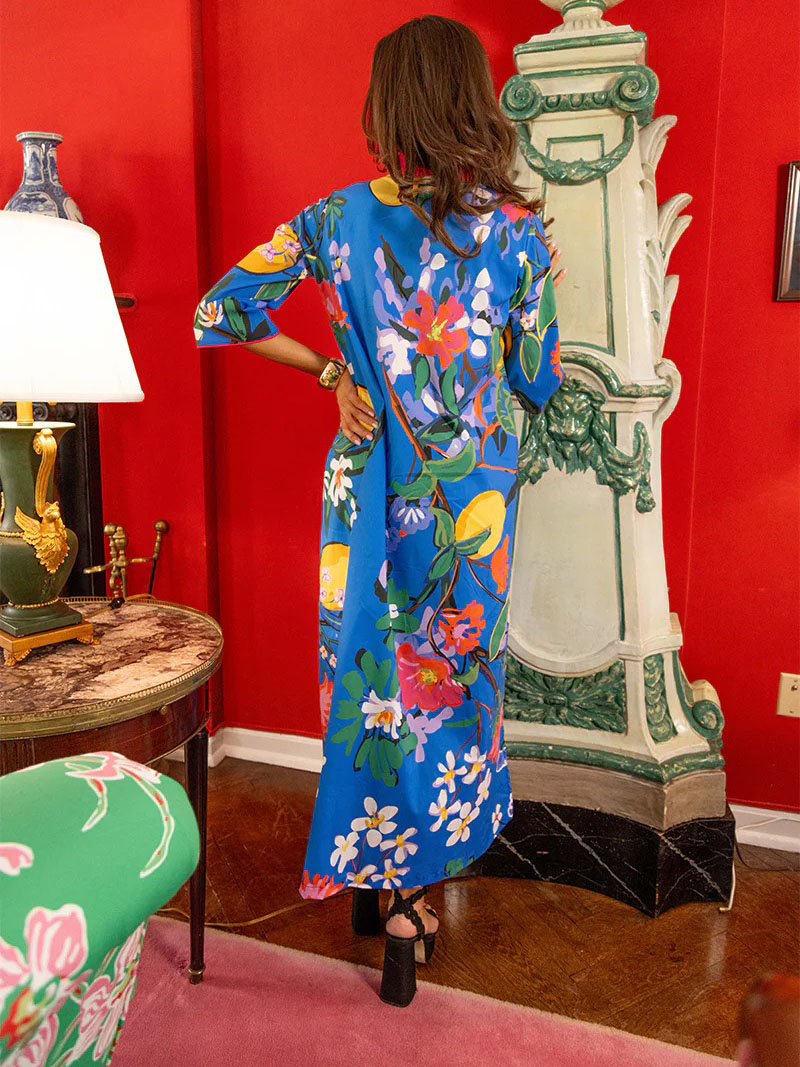 - Design: Relaxed maxi dress; cobalt blue base with floral & lemon print; hot pink V-neck panel; three-quarter sleeves; detachable contrast tie belt