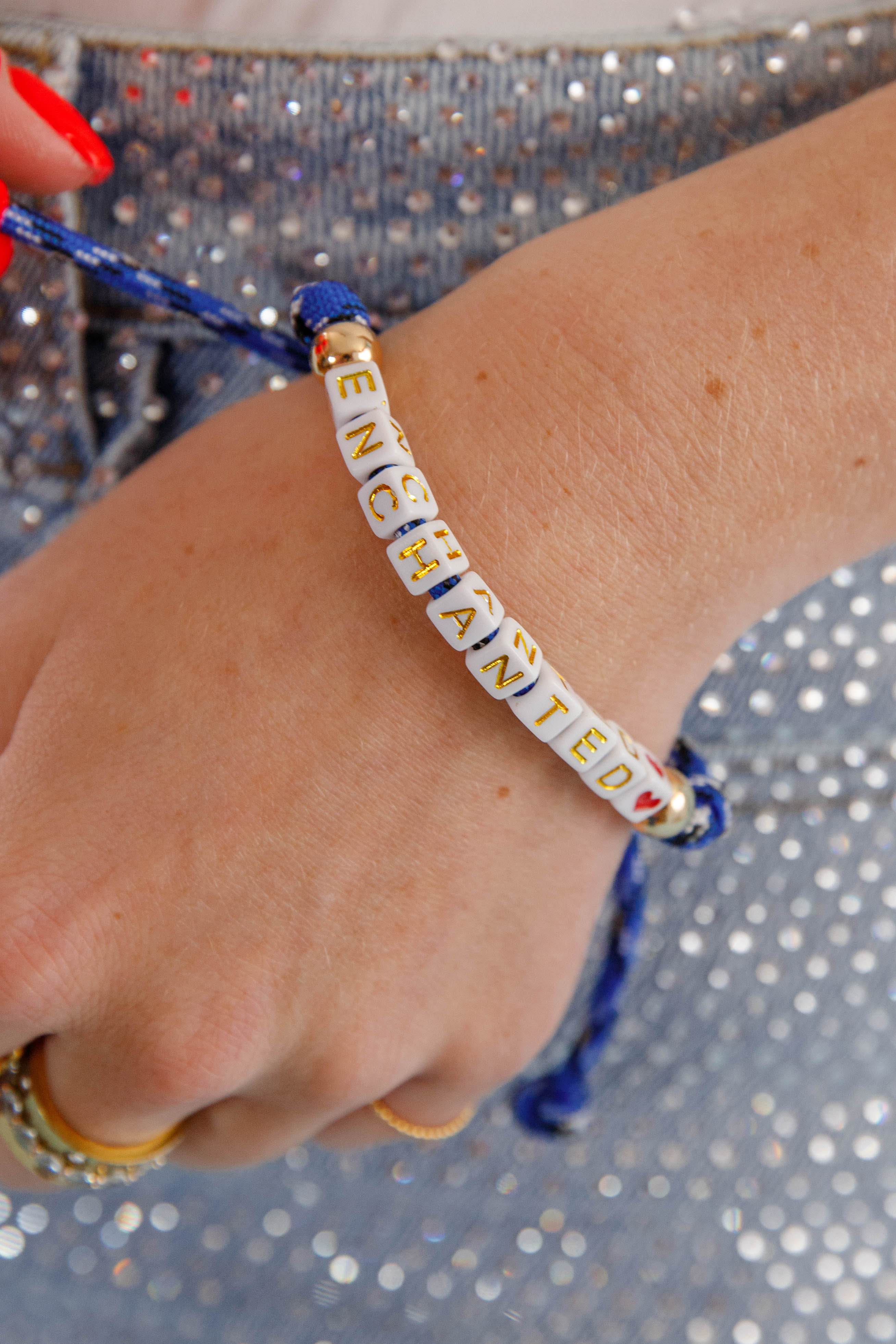 Add a splash of fun to your wrist with this Friendship Bracelet-Enchanted! White block beads shout out "Enchanted" in gold letters, while the slip knot lets you adjust it just right for your perfect fit.