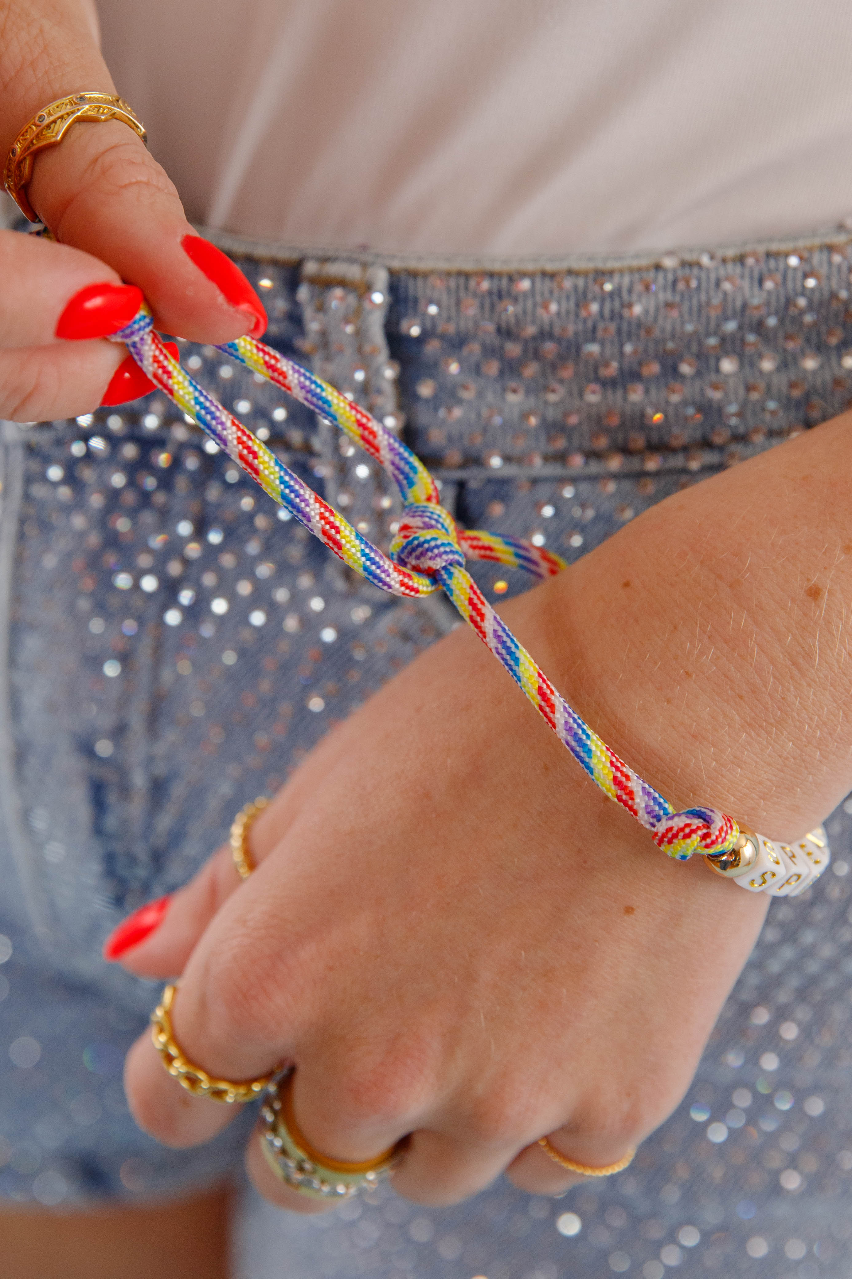 Add a splash of fun to your wrist with this Friendship Bracelet-Speak Now! White block beads shout out "Speak Now" in gold letters, while the slip knot lets you adjust it just right for your perfect fit.