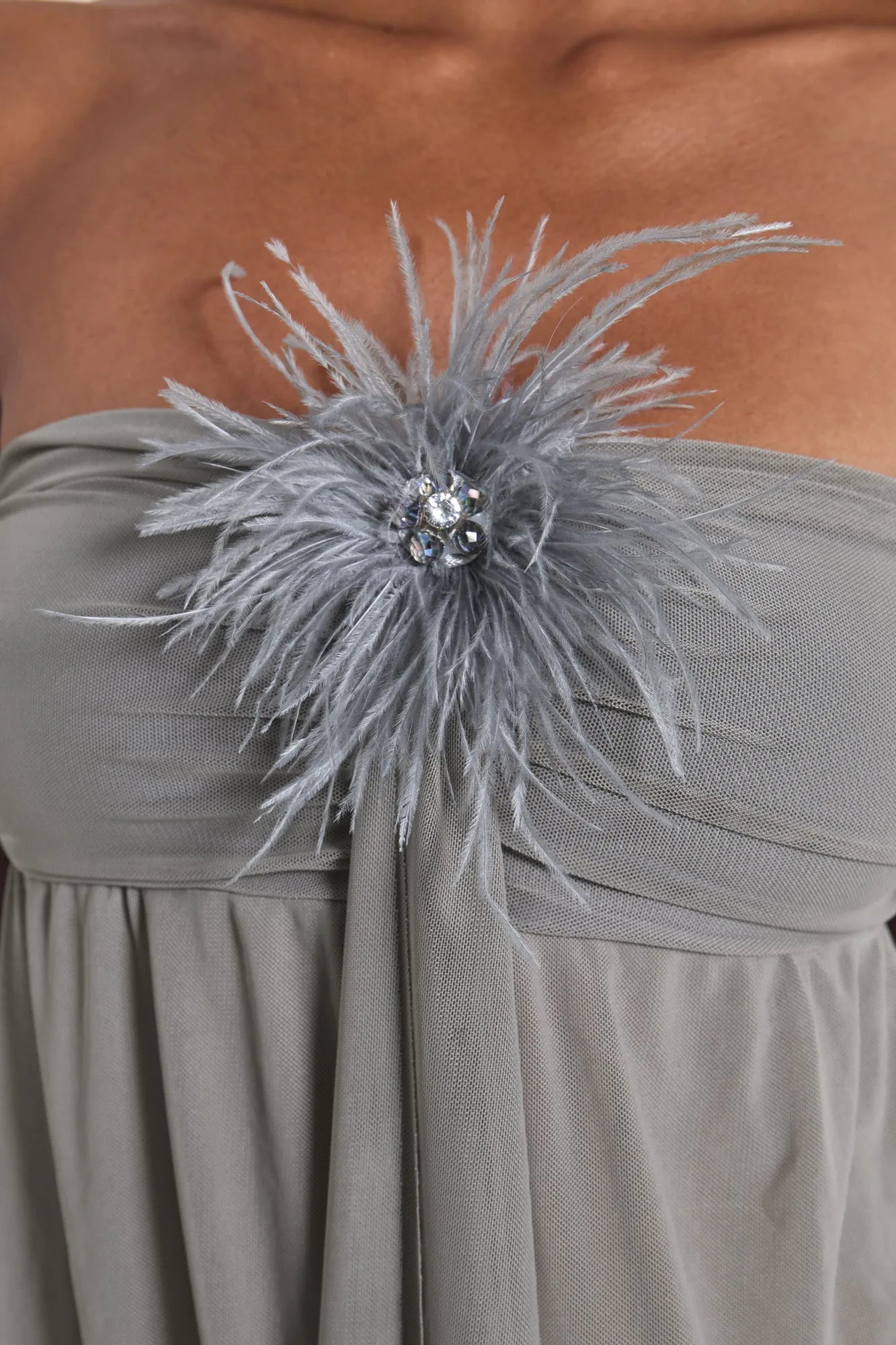 A dramatic mini dress crafted from soft mesh with ruched detailing, feather accents, rhinestone embellishments, and flowing ribbons at the bust.