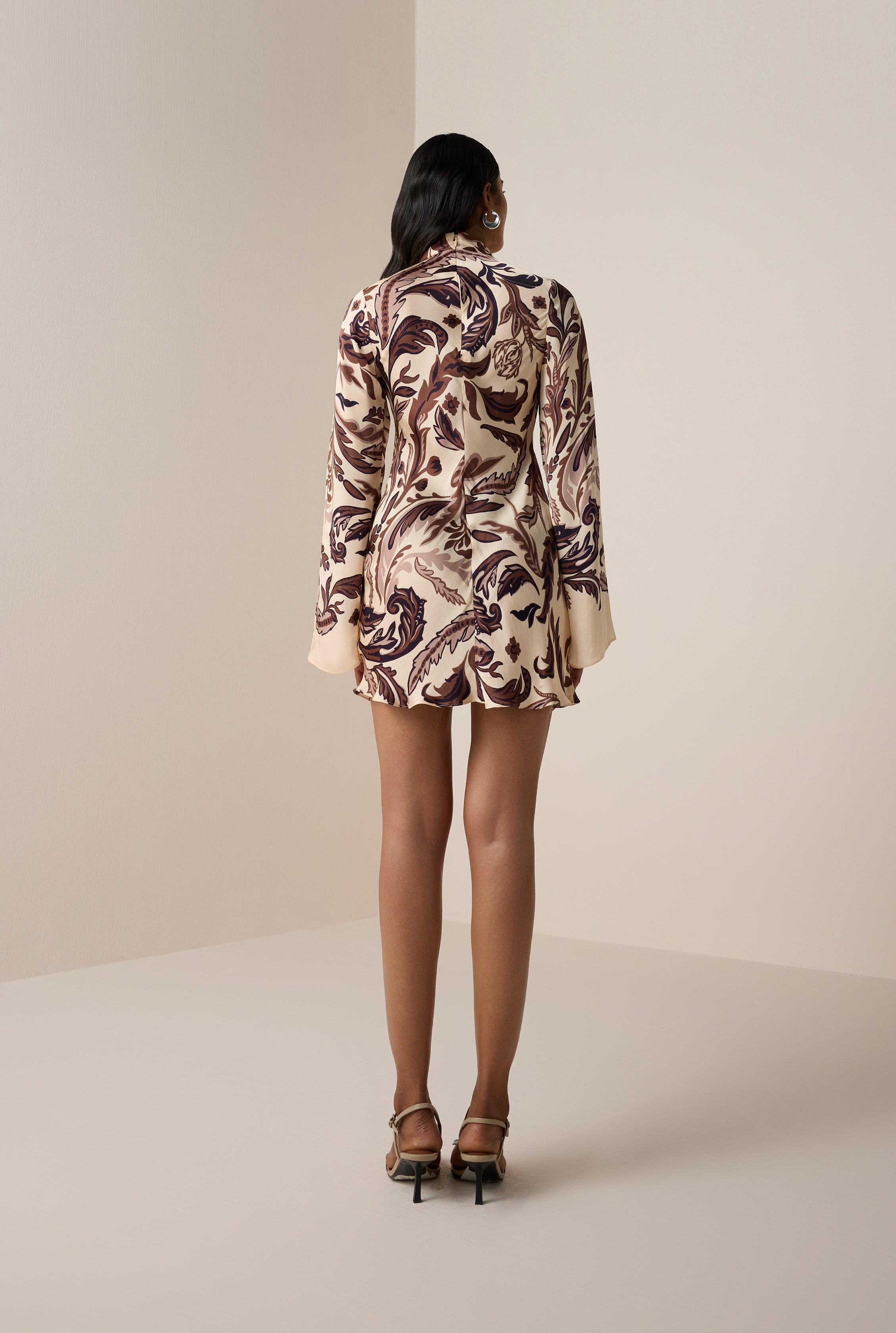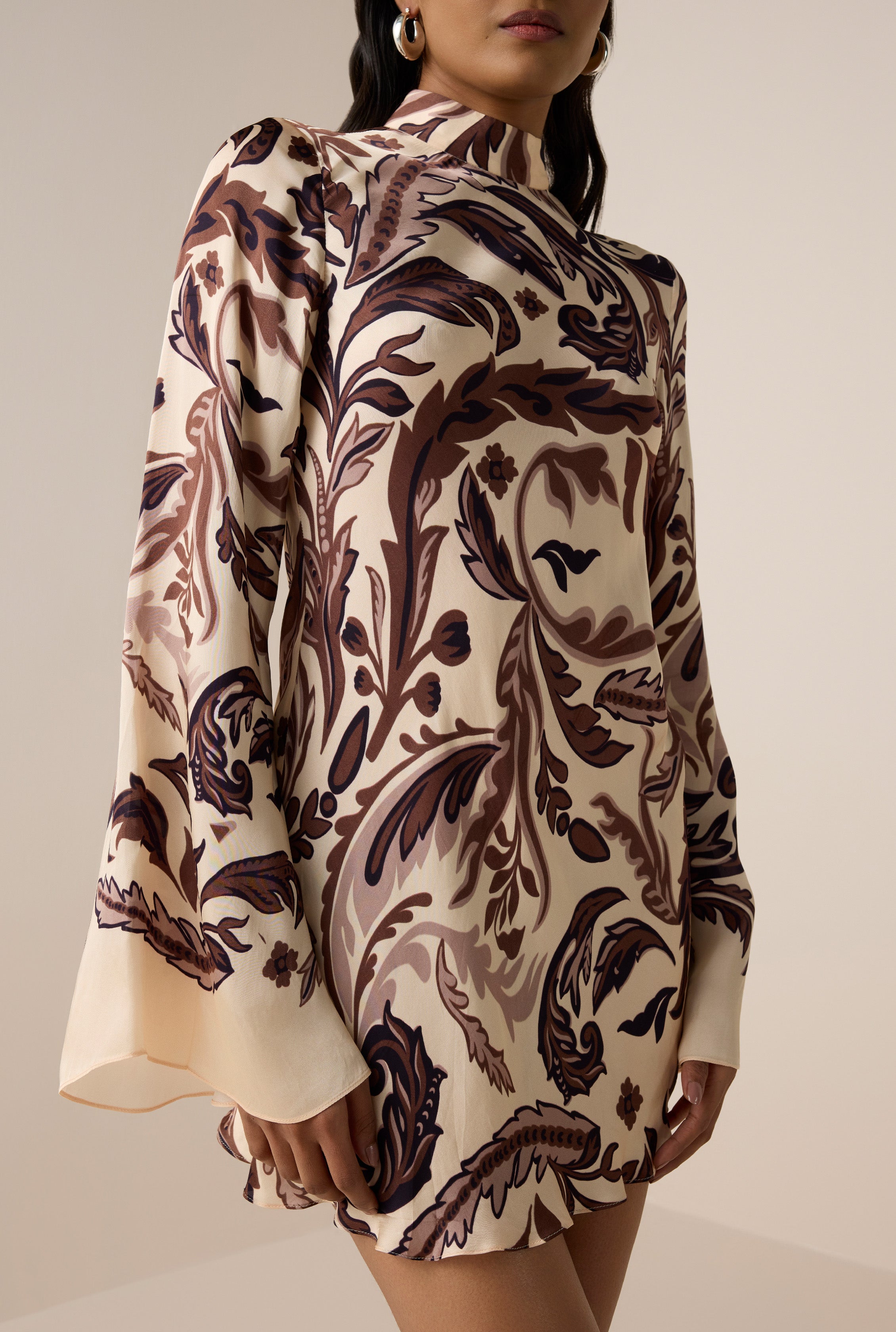 The Lira Mini Dress from our Fall ’25 Collection is a graceful ode to feminine ease. Crafted in soft eggshell viscose satin, this bias-cut mini silhouette features a flattering mock neck and subtle fit & flare sleeves that move effortlessly with you. Adorned with a contrasting brown filigree print, it's finished with a back zipper closure for a seamless look.