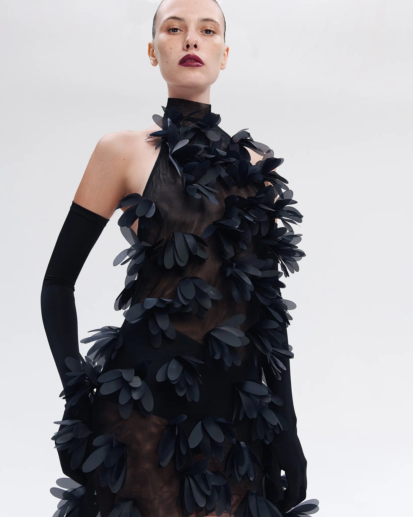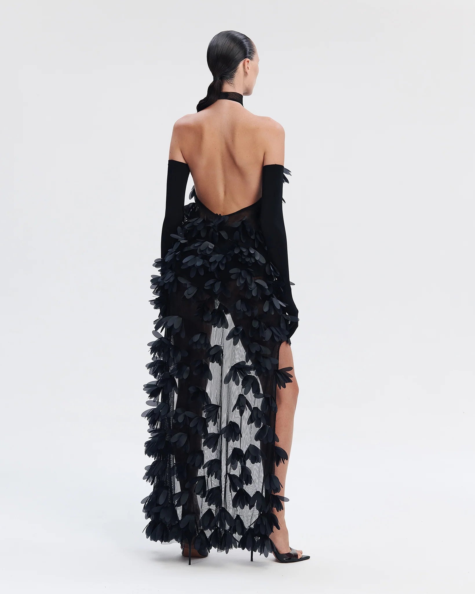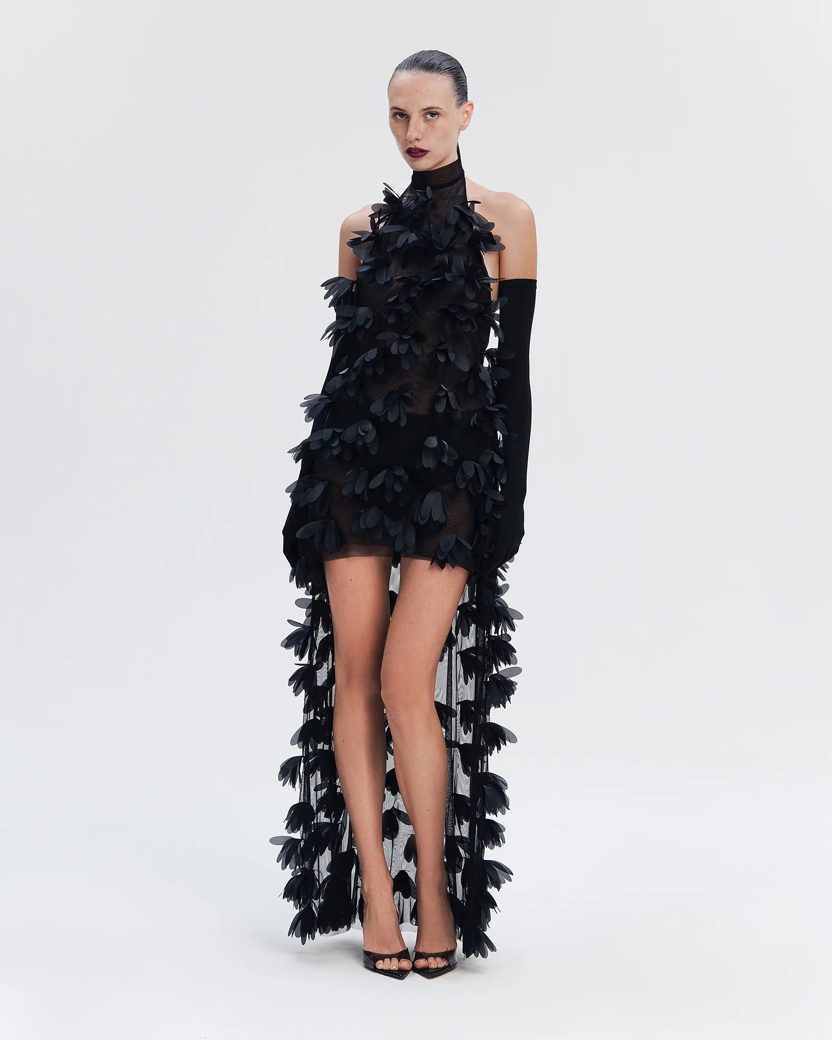 This black halter dress features a dramatic hi-lo silhouette with a sheer mesh finish. The back flows to ankle length while 3D floral appliqués add romantic texture, making it a show-stopping choice for nights out and statement events.