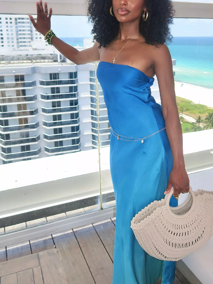 Girls night just got a whole lot more fun, this strapless deep blue to aqua ombre dress is made for oceanside nights and moonlit adventures.
