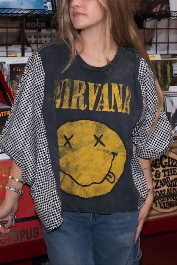 DetailsOne of a kind!Washed Vintage Graphic Tee with Batwing SleeveColor: PictureMaterial: 50% Cotton50% Recycled Mixed FabricSPU:TPCJ25082104Size:One Size Fits MostModel is Wearing a Size OSModelHeight: 5'2"Bust: 34"Waist: 27"Hips: 36"