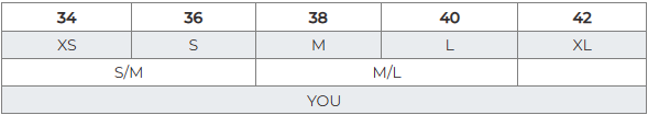 Size S fits sizes 34 and 36, size M fits size 38 and size L fits size 40.