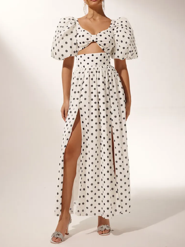 Polka Dot Top, Puff Sleeves, High Slit, High Waist, Shirring Back with high stretch.