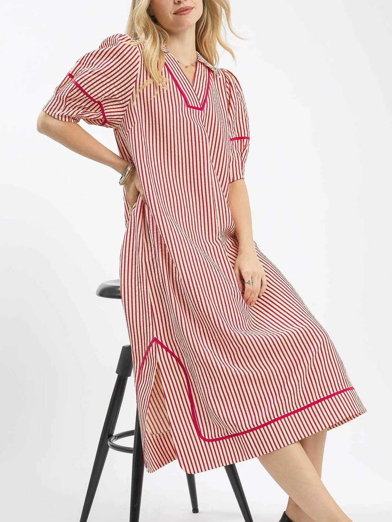 A playful yet polished summer essential, this midi dress features a classic red-and-white vertical stripe pattern that evokes a timeless, retro vibe. The V-neckline with a crisp collar and bold contrast pink trim adds a modern pop of color, while the voluminous puff sleeves create a romantic, feminine silhouette. The relaxed, flowy fit ensures all-day comfort, with functional side pockets and a subtle side slit for ease of movement. Perfect for weekend brunch, beach getaways, or casual office days, it pairs effortlessly with sneakers or Mary Janes for a versatile, laid-back look.