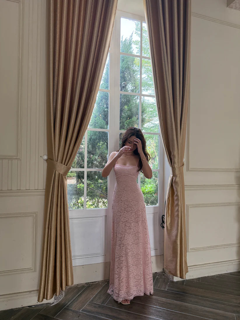Romantic and refined, this pink lace maxi dress features a square neckline, delicate straps, and an open lace-up back.