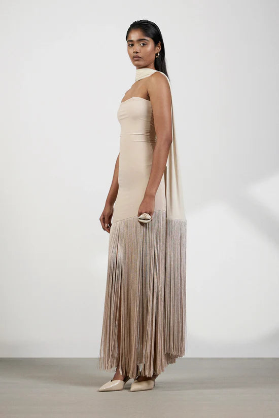 This neutral-toned strapless maxi dress features a sculpting fit and full-length fringe from thigh to hem. Comes with a matching fringe scarf for an elevated, runway-inspired finish.