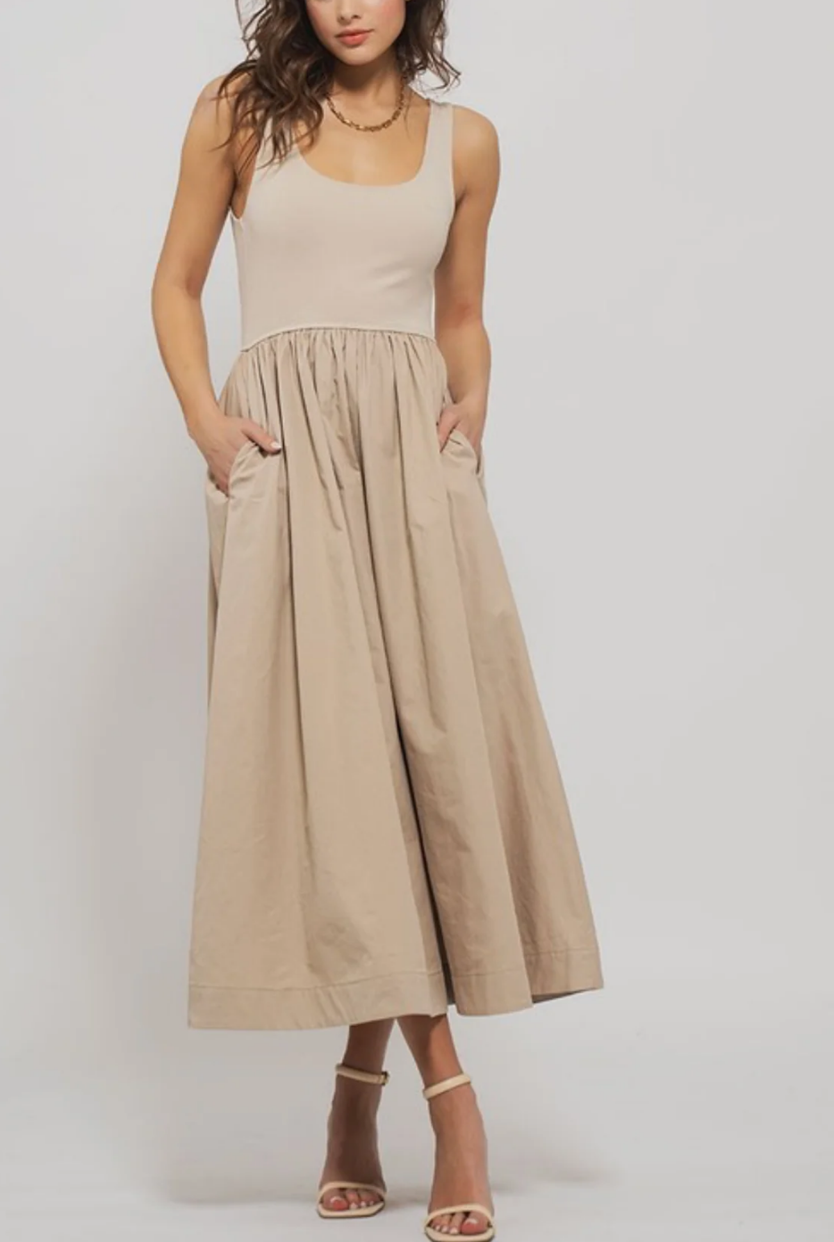 Scoop neck tank midi dress with secret pockets. Perfect for any occasion.